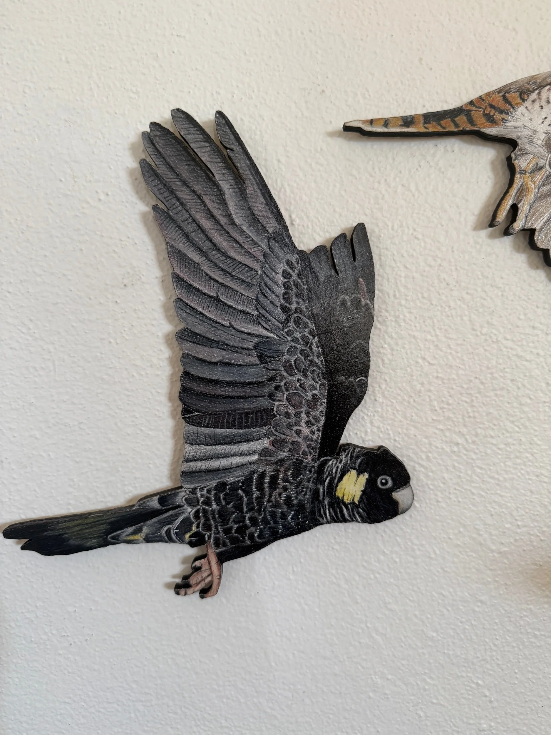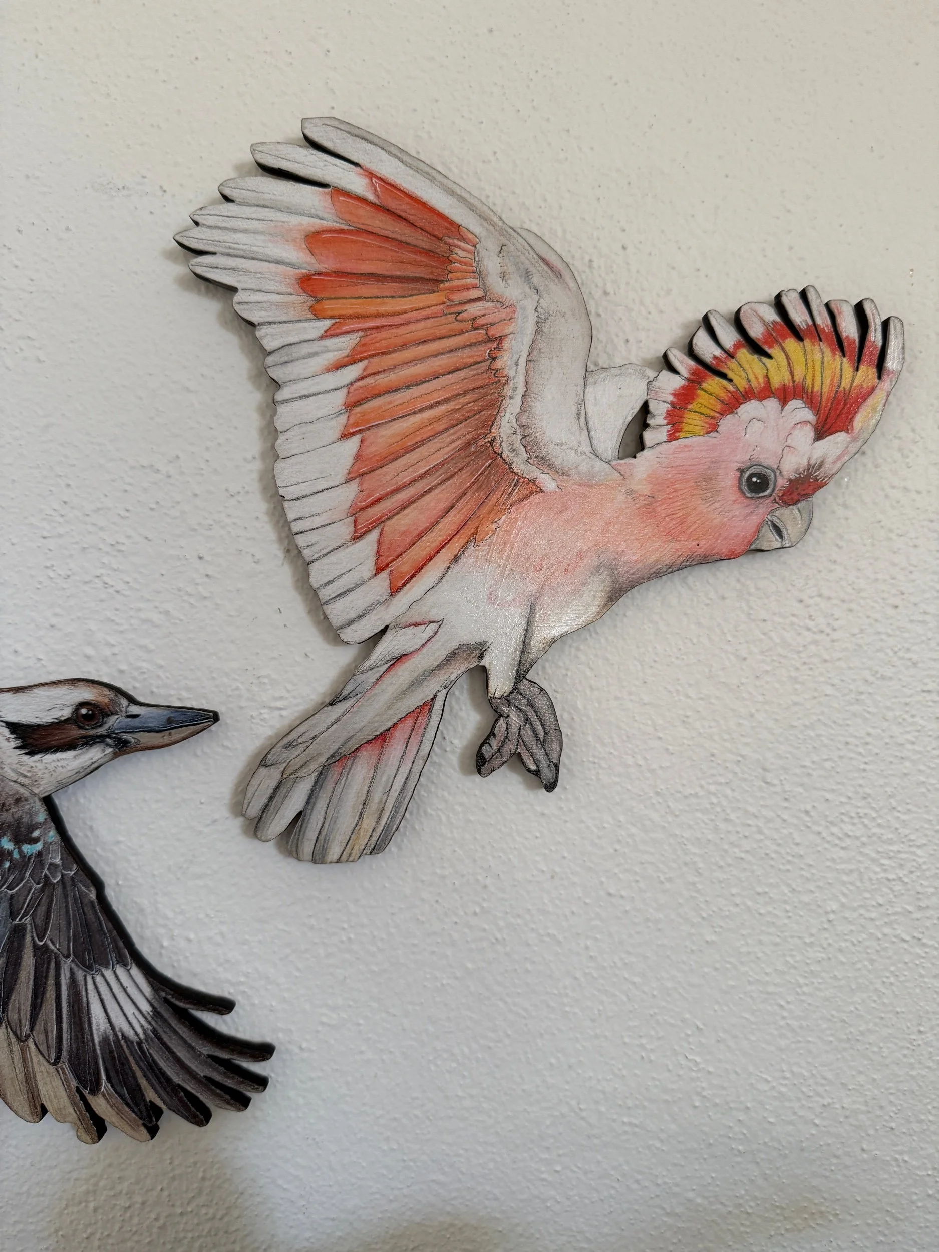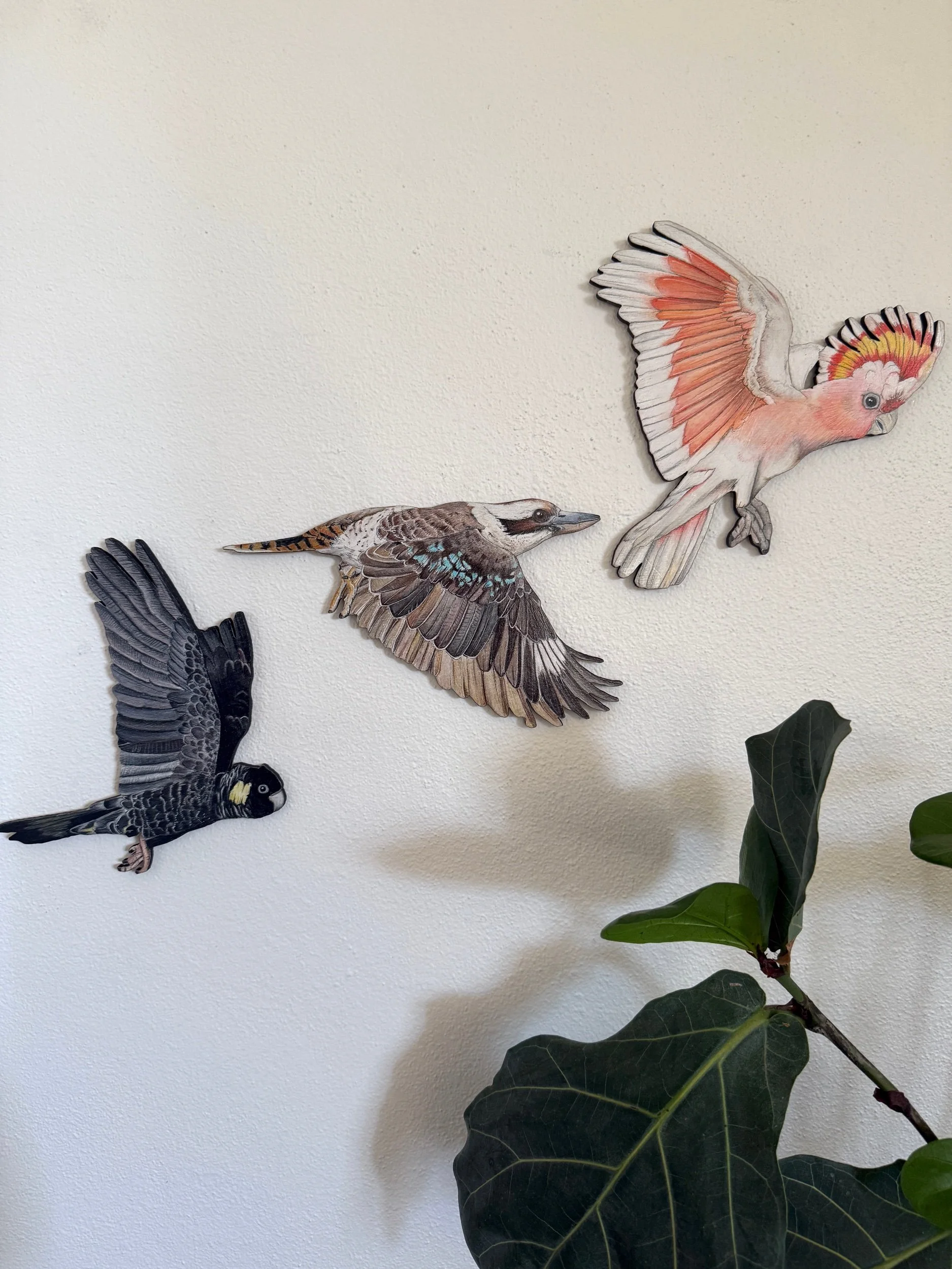 Each bird is approximately 20 -30cm high and 10-20cm wide. 6mm laser cut plywood, hand coloured with Faber Castell Polychromos and Caran d’ache Luminance pencils and finished with an acrylic varnish. Includes hanging materials.