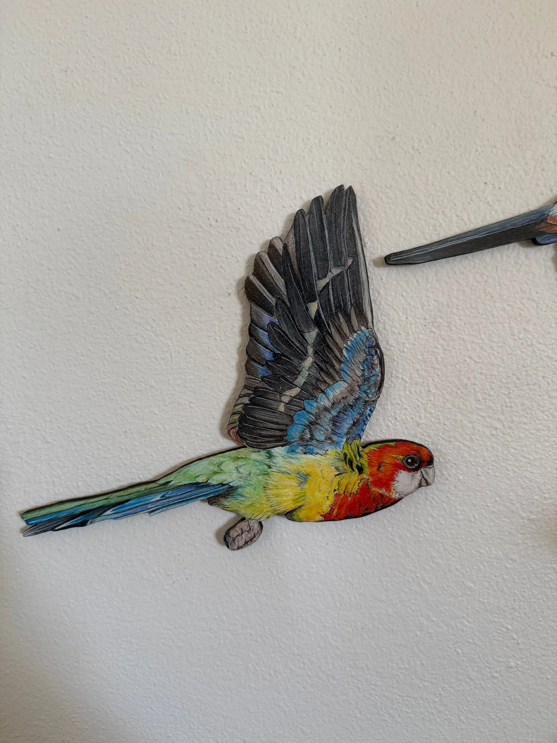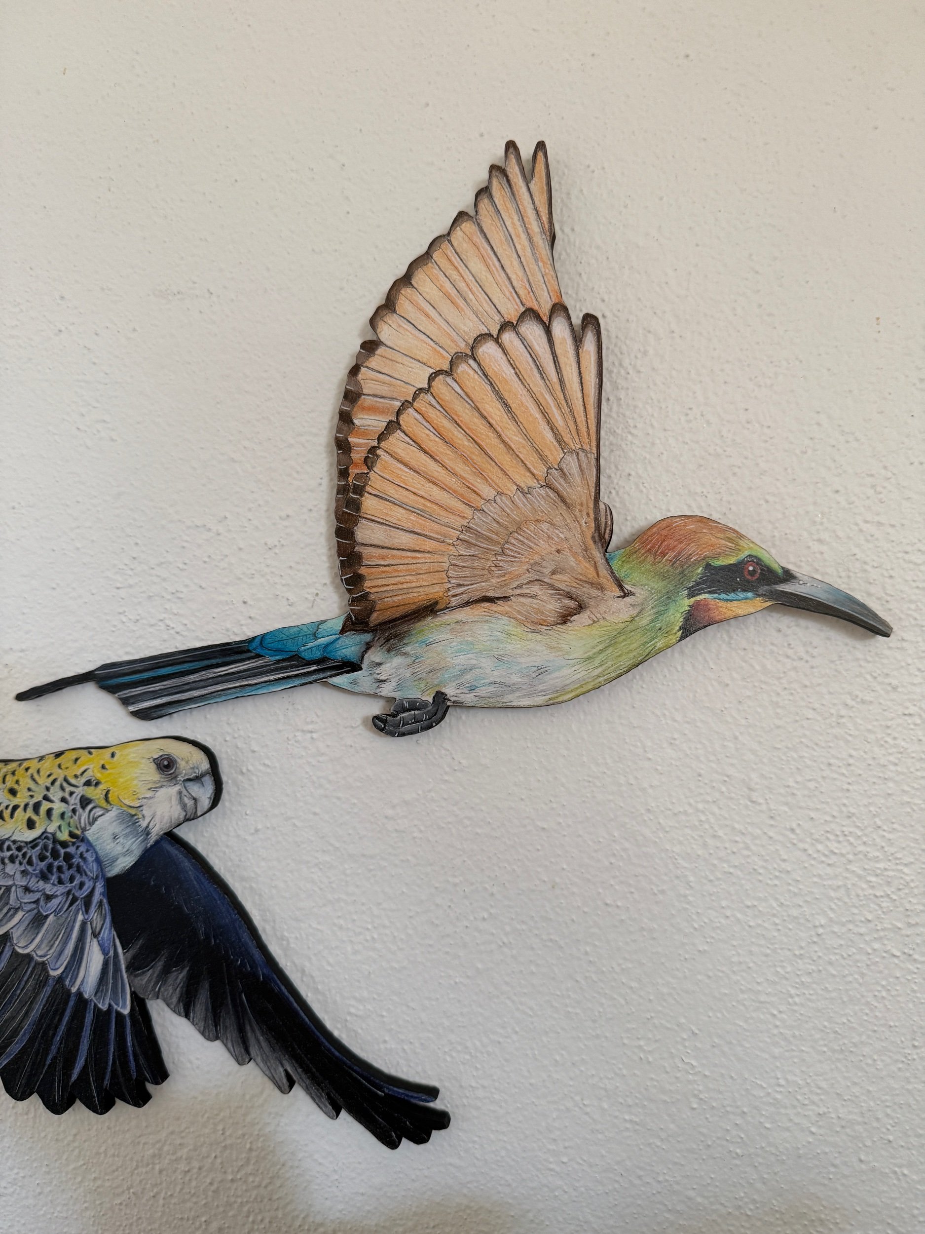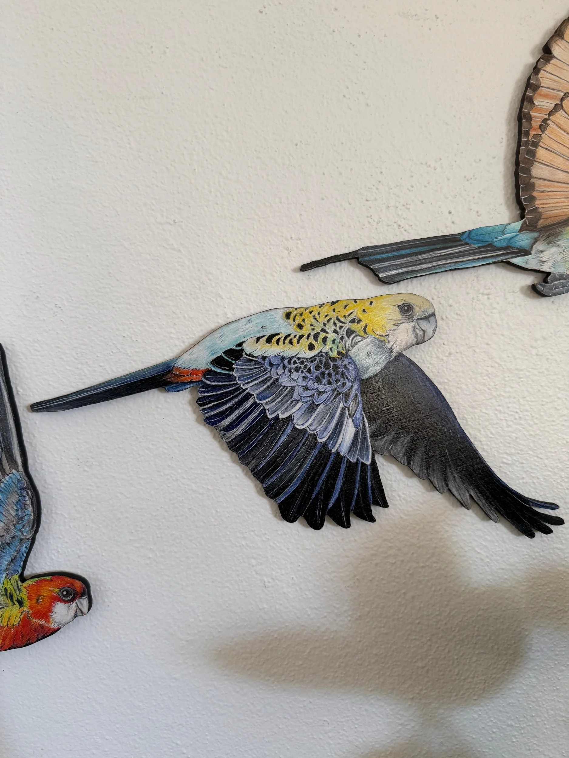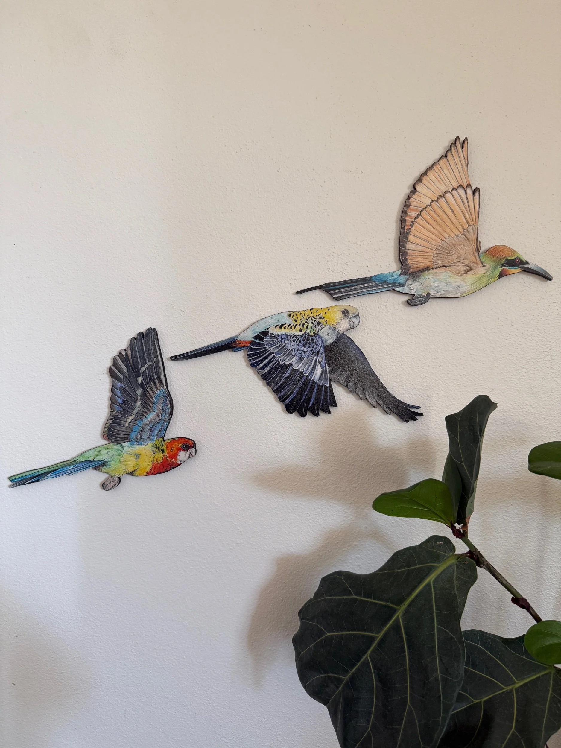 Each bird is approximately 20 -30cm high and 10-20cm wide. 6mm laser cut plywood, hand coloured with Faber Castell Polychromos and Caran d’ache Luminance pencils and finished with an acrylic varnish. Includes hanging materials.