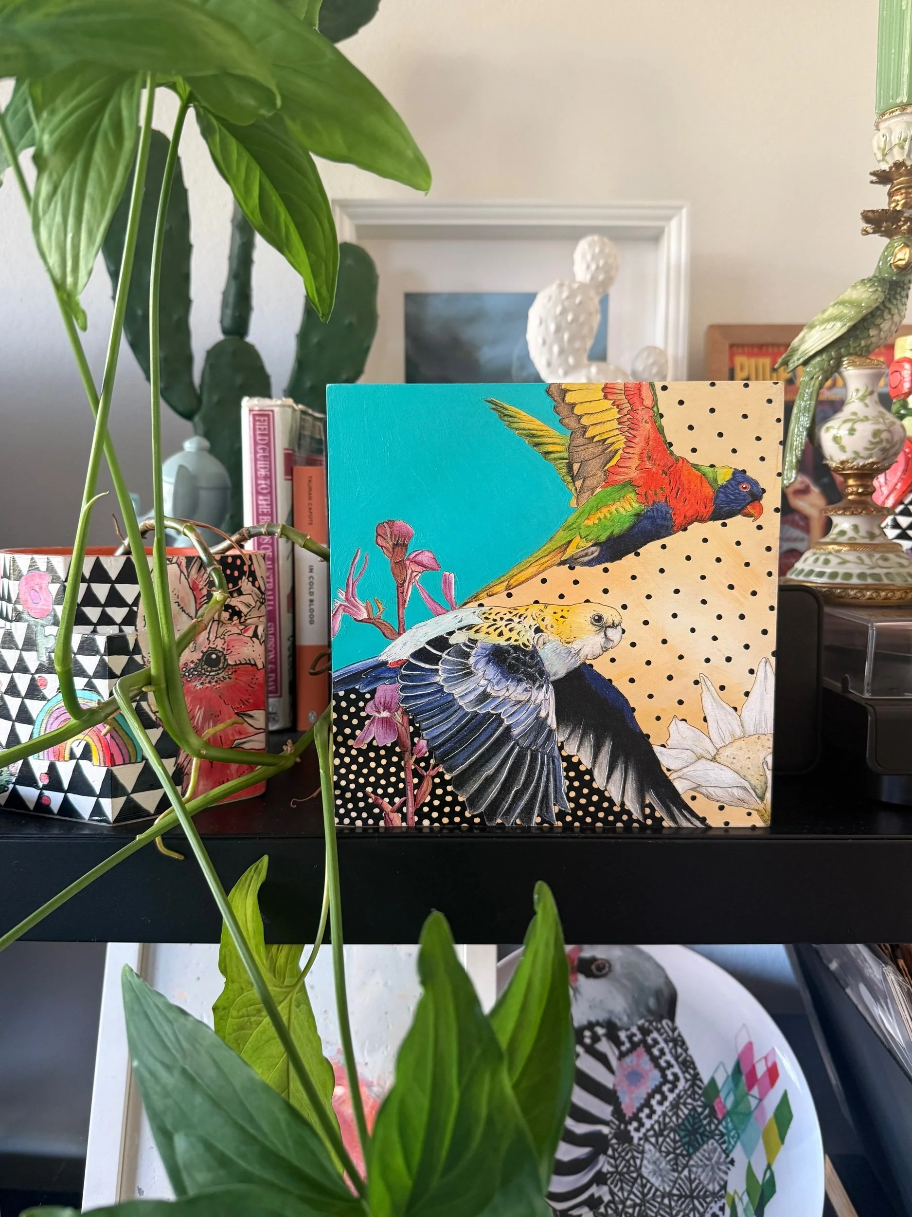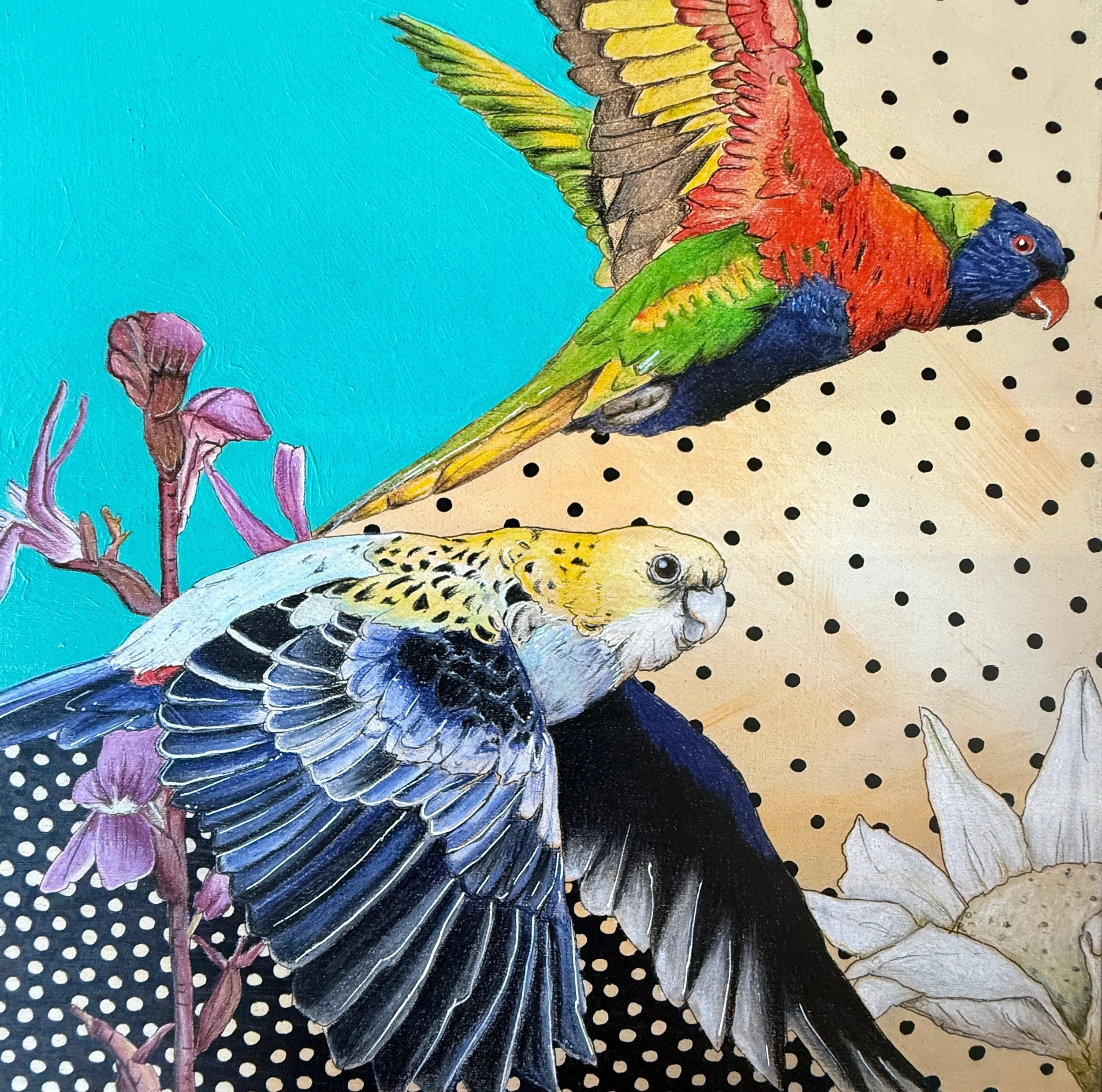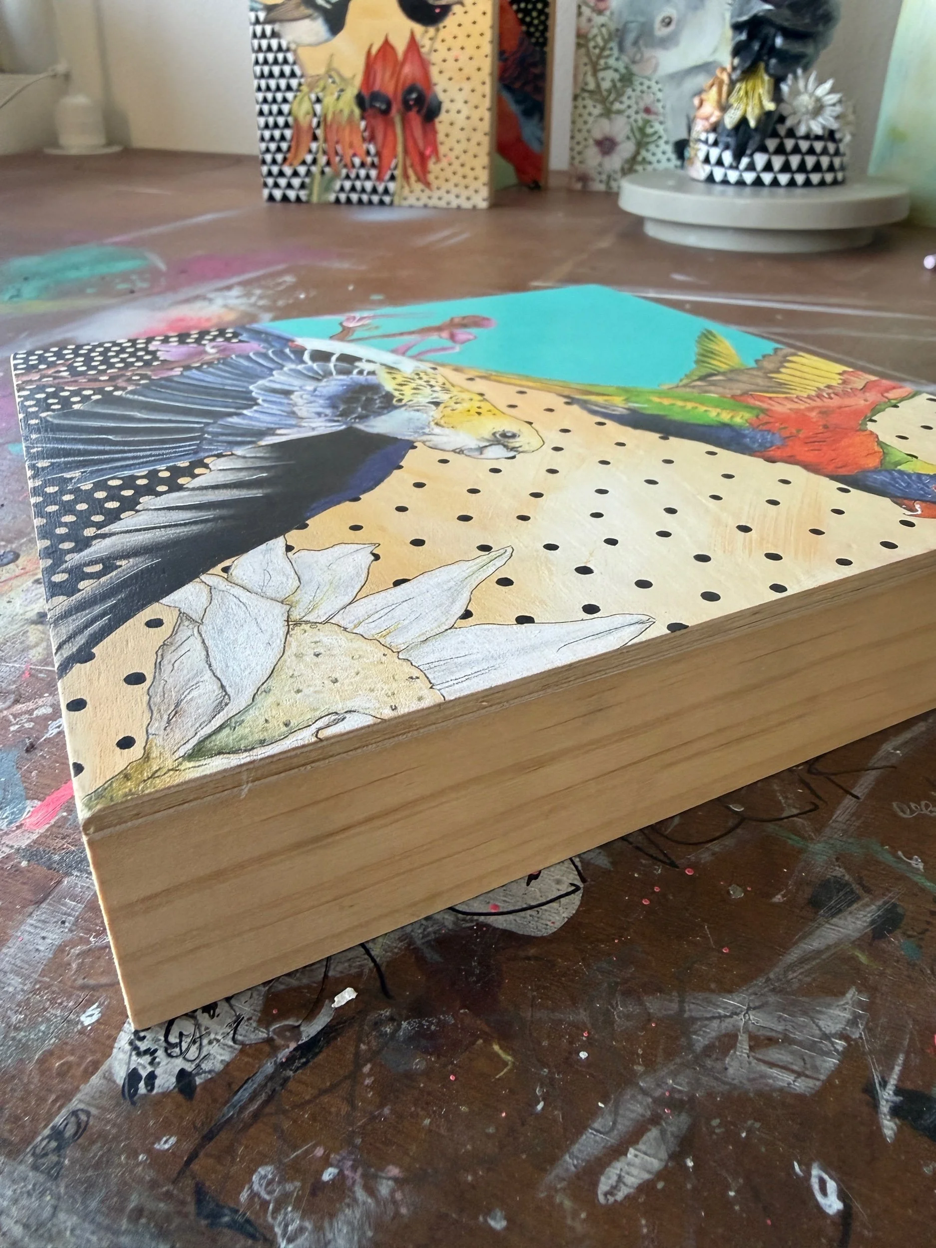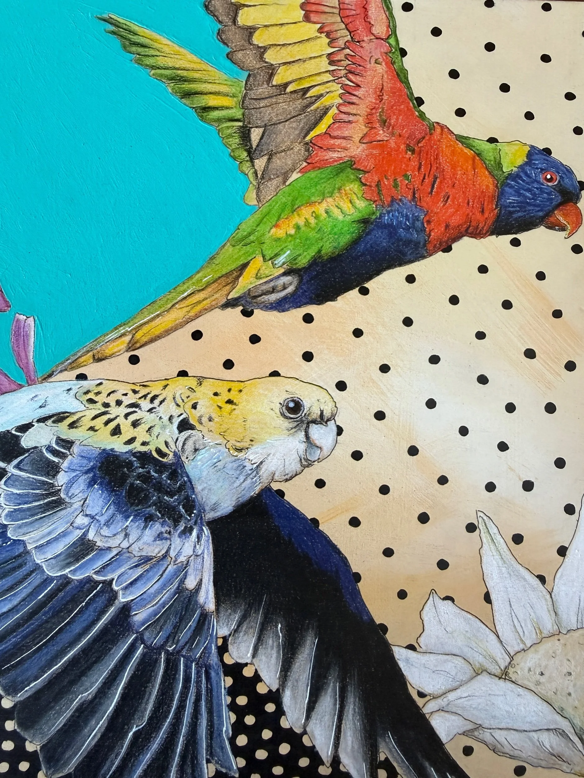 20 x 20cm, 3.8 cm depth. Coloured pencil, acrylic and pen on cradled timber panel. Finished with an acrylic gloss varnish. Free shipping in Australia