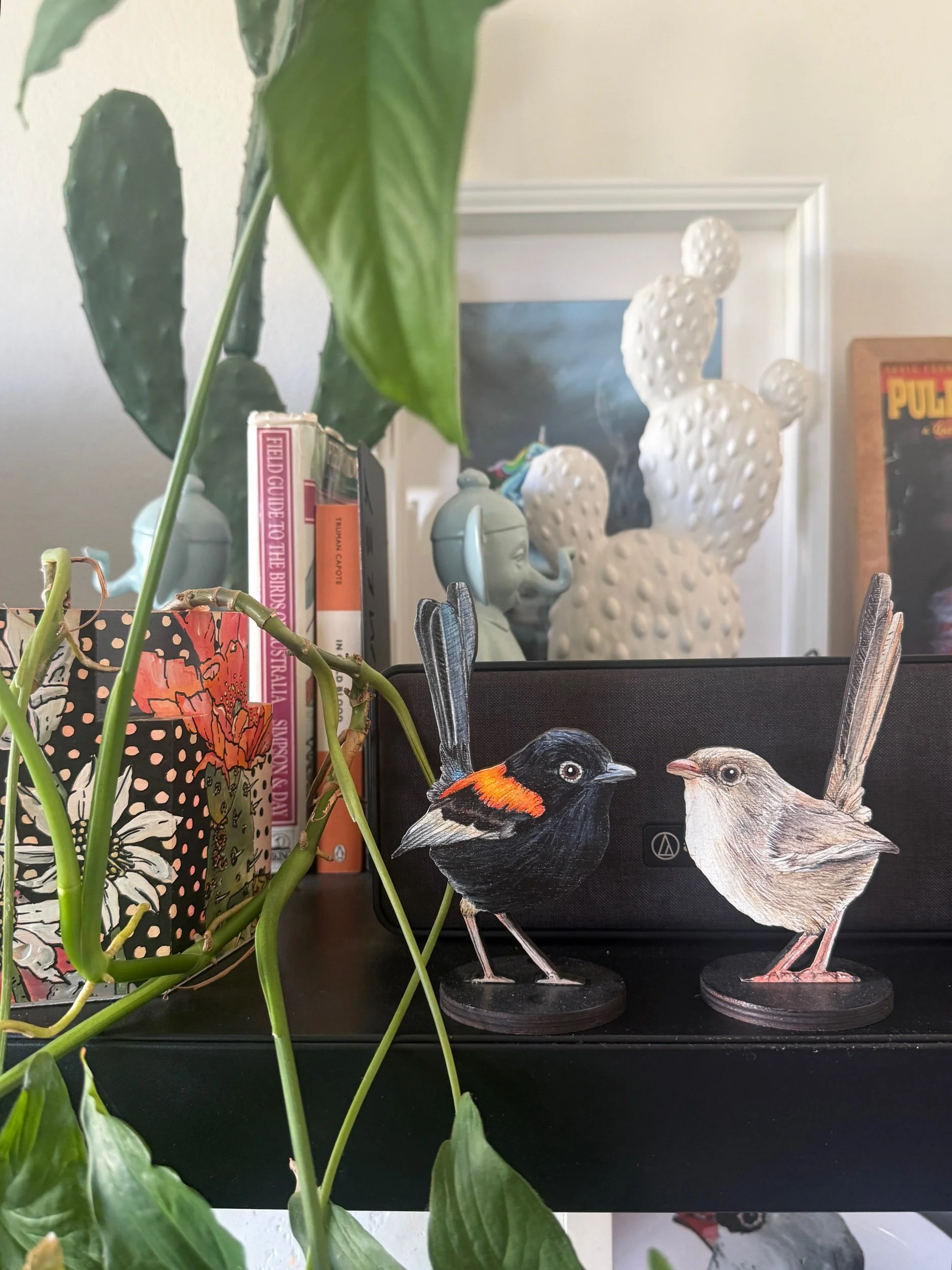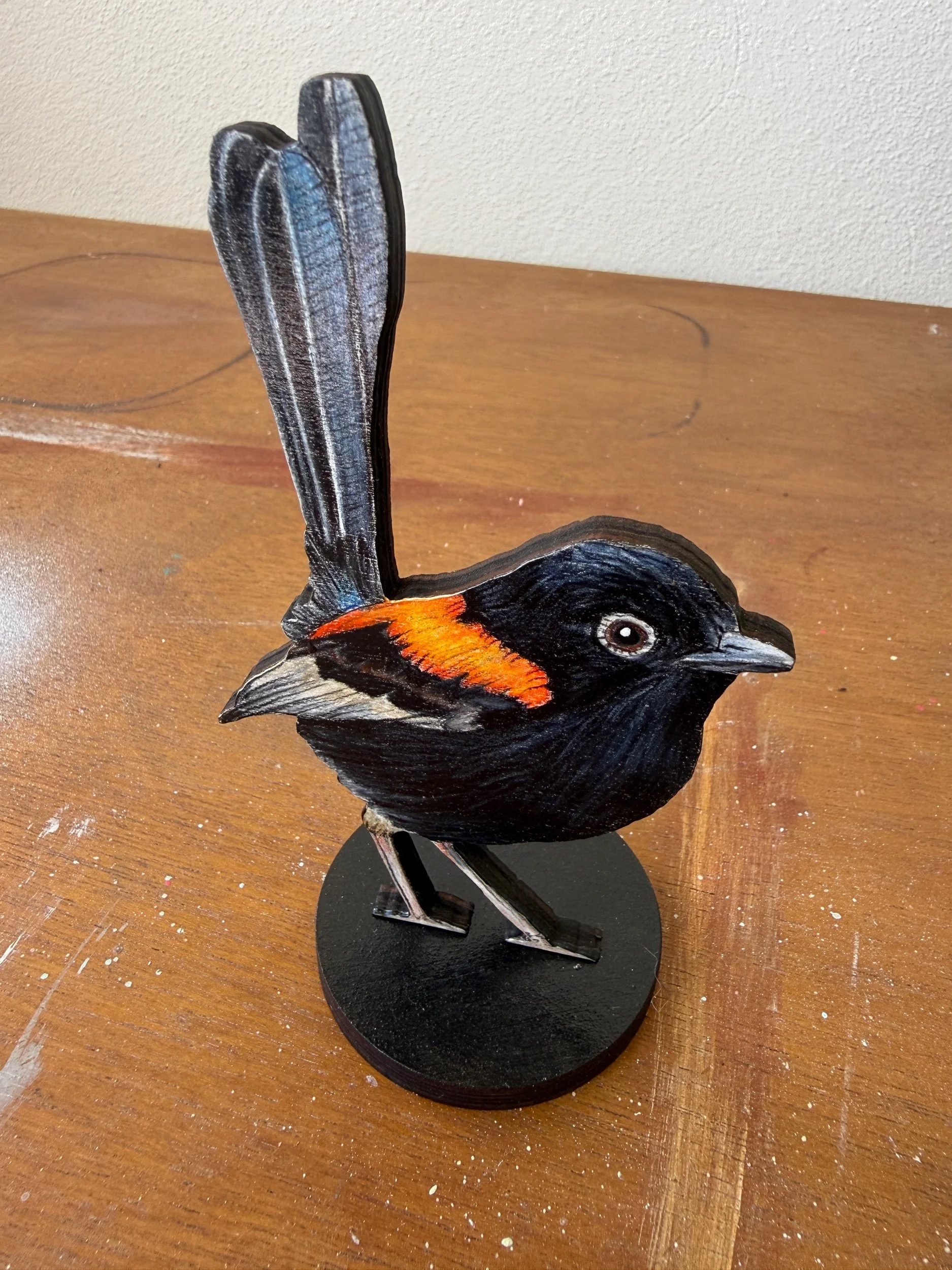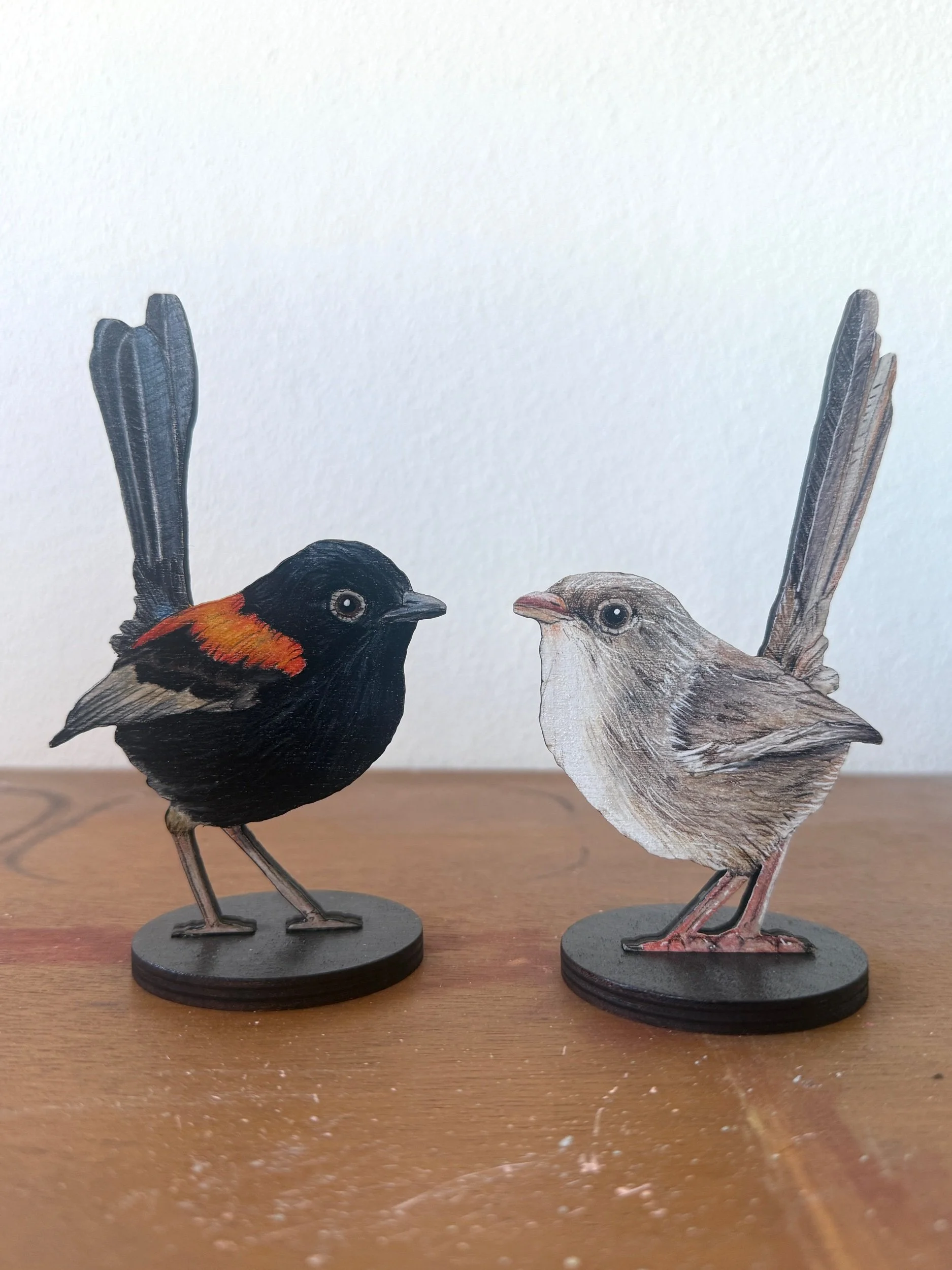 Male and female Red-Backed Fairywren. Approx 14 x 10cm each. 6mm laser cut plywood, hand coloured with Faber Castell Polychromos and Caran d’ache Luminance pencils and finished with an acrylic varnish. Includes stand.